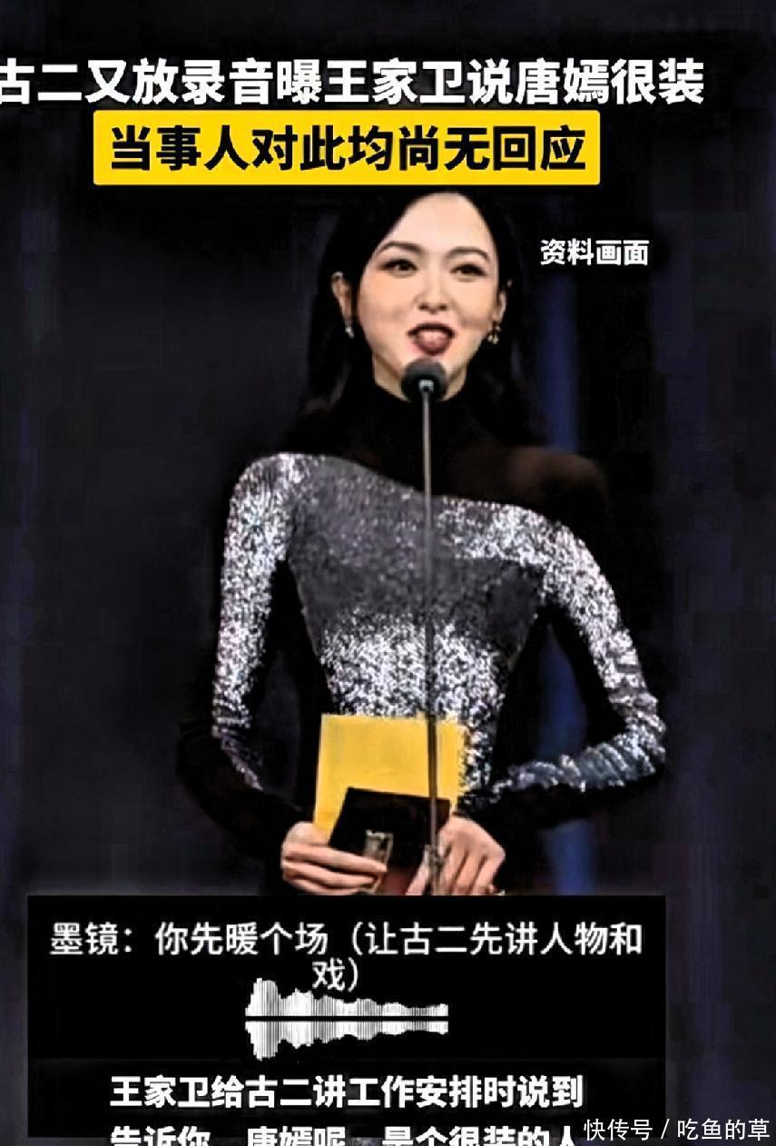 这事儿发生在10月31日,青年编剧“古二”突然放出一段录音,直接把娱乐圈炸了个底朝天!录音里,著名导演王家卫一边安排工作一边说,唐嫣“很装”,还提醒别让她先到现场讲戏。这一爆料一出,瞬间冲上热搜,大家都在猜测:到底是戏里“装”,还是戏外“装”?事情的起因很简单,古二之前曾被剧组指控偷录、加工主创的私人对话,但他一直没有回应。直到这次,他放出录音,才算把话题推到台前。录音内容让人震惊:王家卫在安排拍摄细节时,直言唐嫣“很装”,还提醒别让她抢戏,似乎暗示这位女星在现场表现得不太自然。